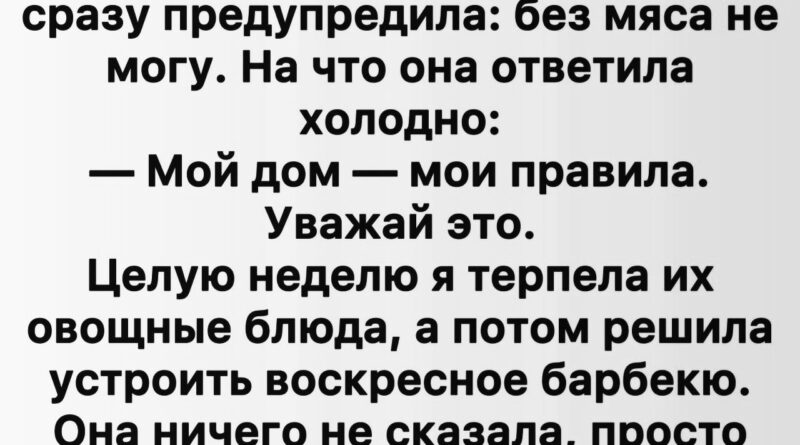Прошла неделя. Семь дней, полных молчаливого контроля и сдержанной вежливости. Я терпела, готовила сама себе еду, старалась не нарушать «правил», но чувство тоски росло. И тогда родилась дерзкая идея: воскресное барбекю. Я решила вернуть себе часть привычной жизни, почувствовать вкус того, что люблю, и, возможно, вновь ощутить радость общения за столом, где аромат мяса манит и согревает.